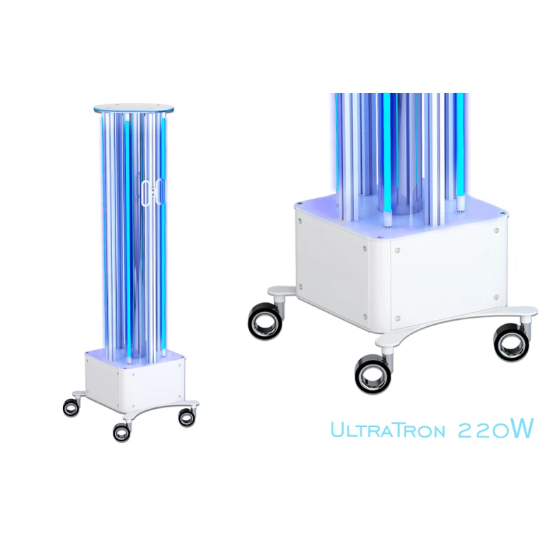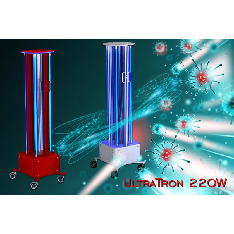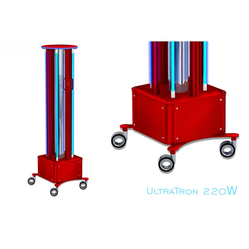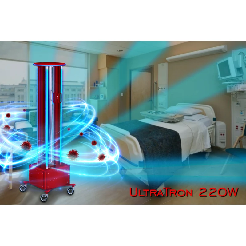 Pro nemocnice, kliniky a všechna zdravotnická zařízení jsme vytvořili mobilní germicidní UV lampu UltraTron-220W (4 lampy) otevřeného typu. Profesionální vybavení je vybaveno 4 baktericidními zářivkami emitujícími UVC - krátkovlnné UV záření germicidního dosahu. Baktericidní lampy jsou vyrobeny z uvolevního skla - přírodního materiálu, který propouští UV záření s vlnovou délkou 254 nm a filtruje (zpožďuje) ozonotvorné záření s vlnovou délkou 185 nm. Díky jeho aplikaci se nám při zpracování areálu podařilo minimalizovat tvorbu ozónu ve vzduchu.
