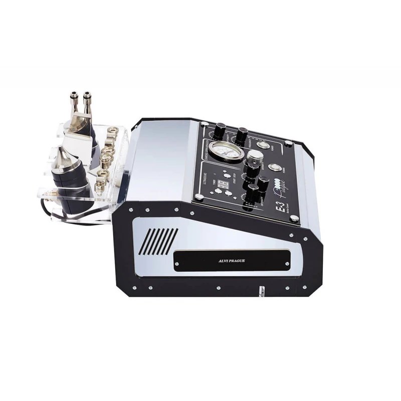 Pro možnost provádění povrchového nebo středně hlubokého mechanického peelingu pomocí nástavců s diamantovým postřikem je kosmetický přístroj E-3 doplněn o kompresor, který vytváří silné vakuum (60-70 mm Hg) pro napnutí kůže a rychlou absorpci loupaných částic.