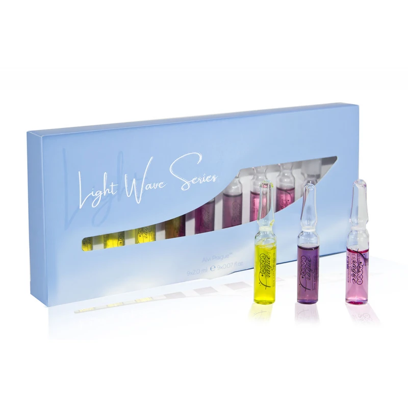 Sada ampulí Light Wave Series 9 ks byla vytvořena pro profesionální péči o pleť obličeje, krku a dekoltu v rámci kosmetologických protokolů fotochemoterapie. Součástí sady jsou tři typy ampulí, které cílí na různé estetické potřeby pleti: RegeVio – pro problematickou a mastnou pleť, YellowRadiance – pro korekci hyperpigmentace a nerovnoměrného tónu, RedRepair – pro citlivou, podrážděnou a dehydratovanou pleť. Sada je určena výhradně pro profesionální použití s přístroji Alvi Prague Autobiography Photon Pro, Photon Pro a Photon Pro Mini.
